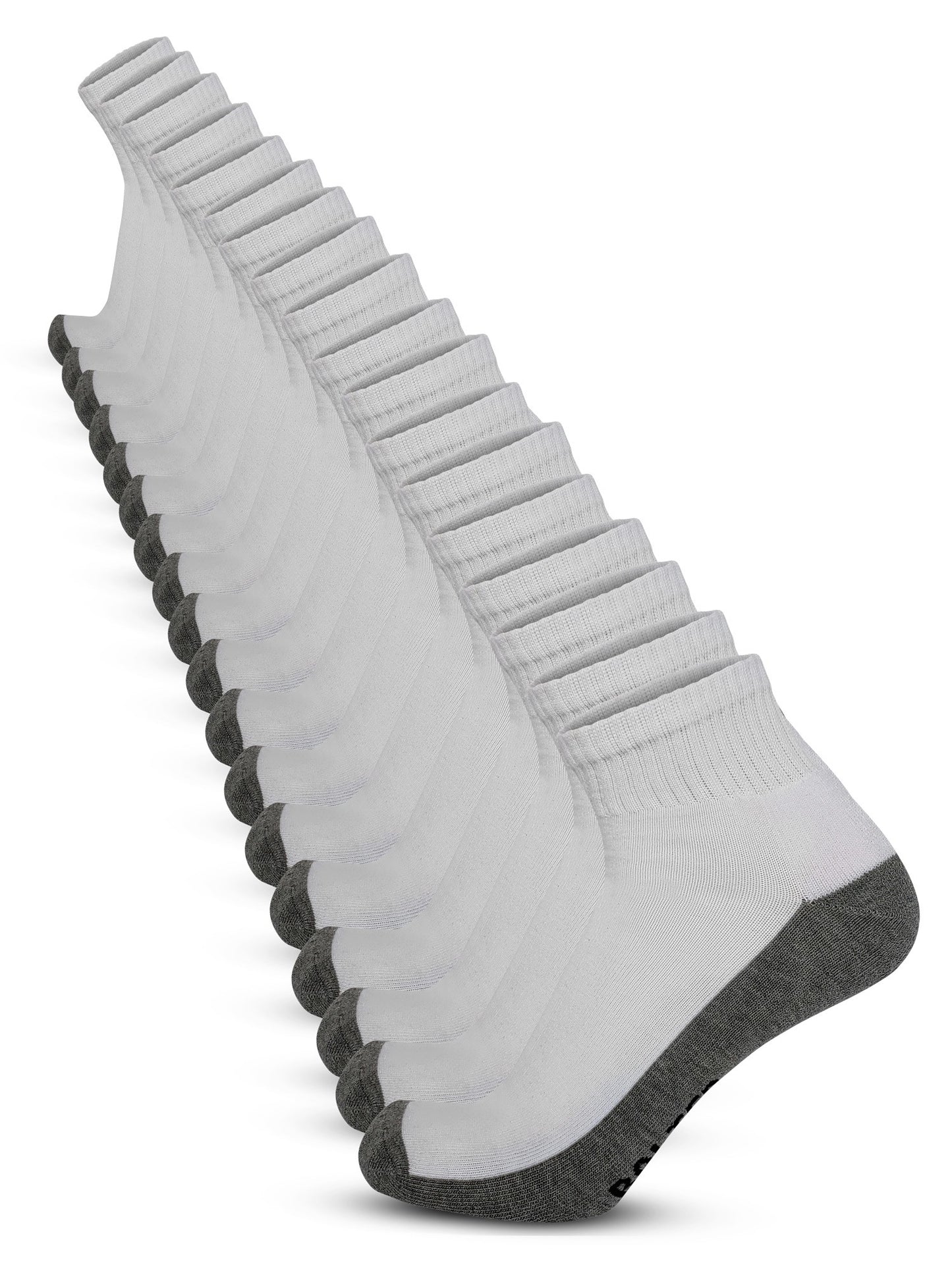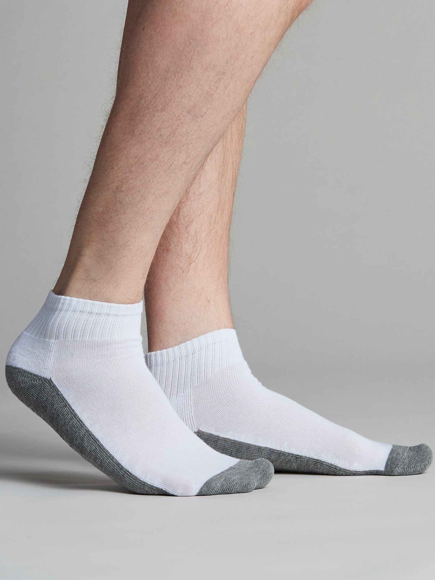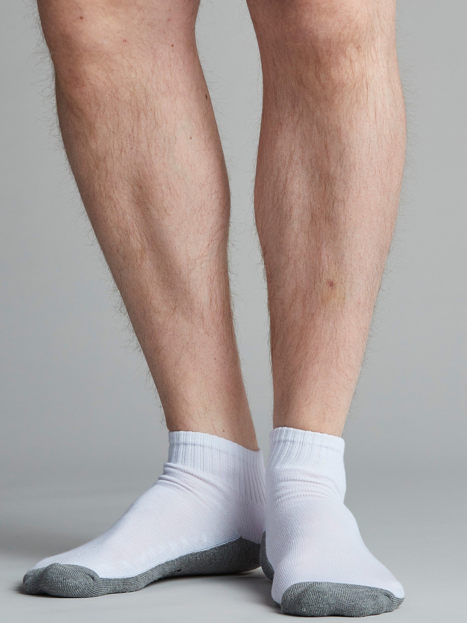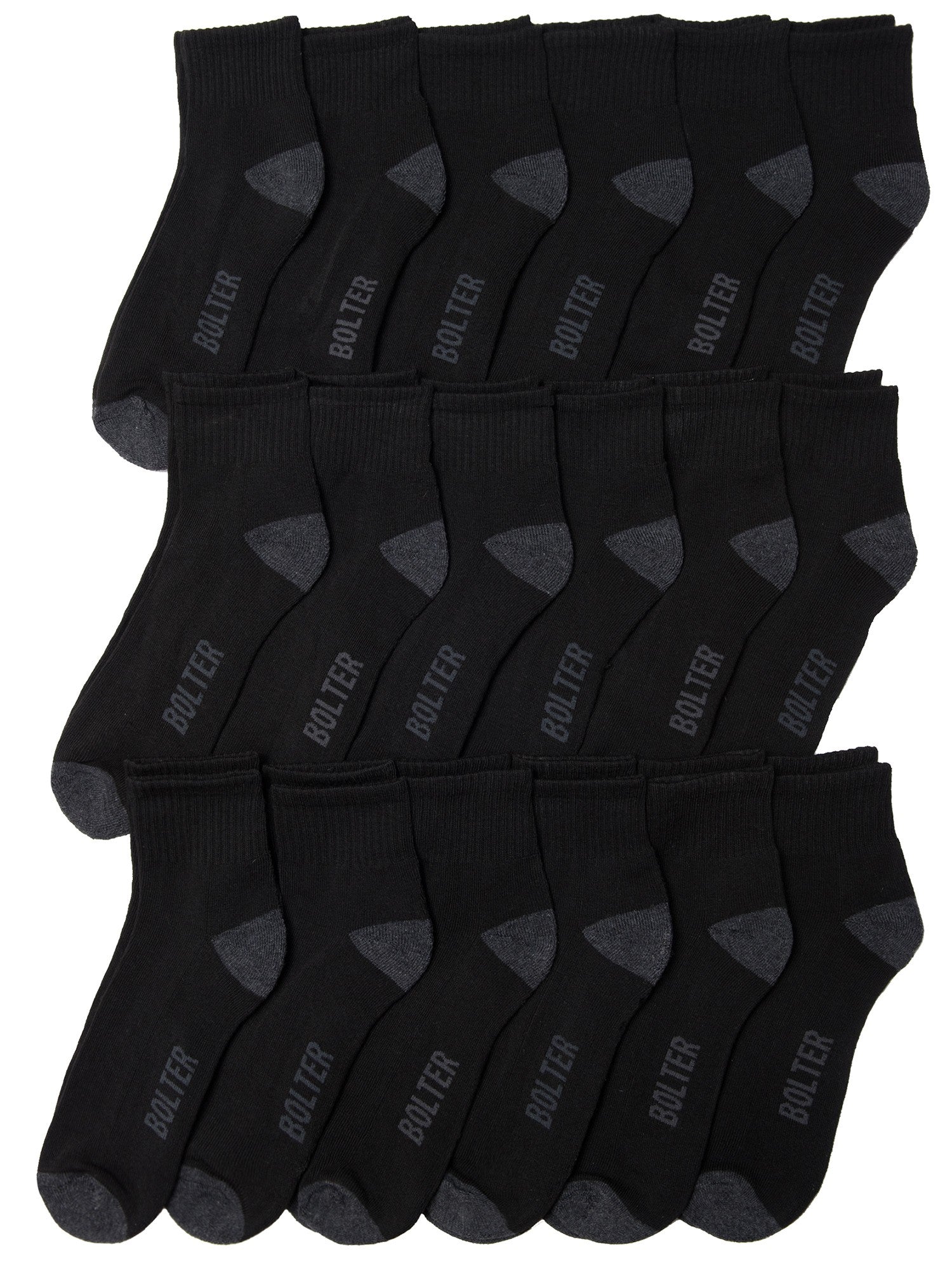 18 pairs of Bolter ankle socks in black or white. Our ankle socks are made from a Polyester/Nylon/Spandex fabric combination. No cotton - which means you can wear these to the gym with confidence that your athletic shoes won’t be chafing your heels. These ankle height socks don’t slide down - and that’s just what you need for all day use. Our ankle socks transition easily from work to gym. So ditch having gym socks vs day socks - get our versitle bulk pack of ankle socks and reduce sock headaches. Low quarter sock height, lands just above the ankle - which will show on a traditional athletic shoe a couple of inches.